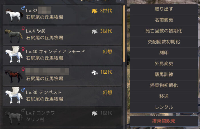 厩舎に装備をすべて取り払った状態で預けて「駿馬訓練」を選びます。