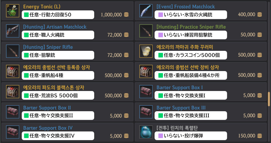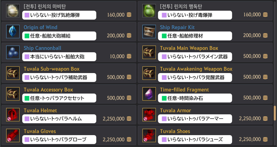 大砲補給アイテムと修理材は船コンテンツをやる場合は欲しいかもしれない。