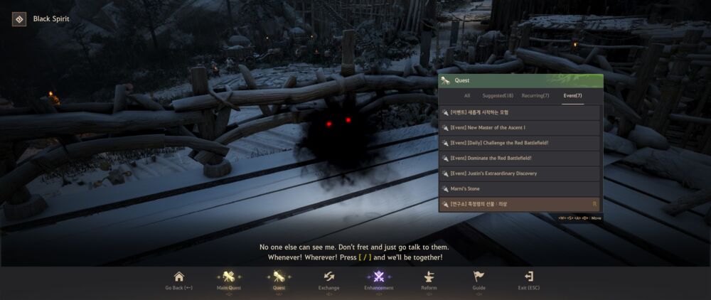依頼タイプを全体にしてから闇の精霊を呼び、「Quest」→「Event」→「[연구소] 흑정령의 선물 : 의상」で依頼を受けましょう。