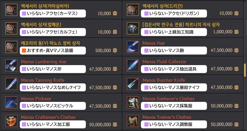 - 에오라의 동(V) 마노스 장비 상자(真Vマノス道具・装備セット)