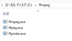 上の画像ならCドライブ直下に「ffmpeg」フォルダを作って置きました。パスは「C:\ffmpeg」ですね。